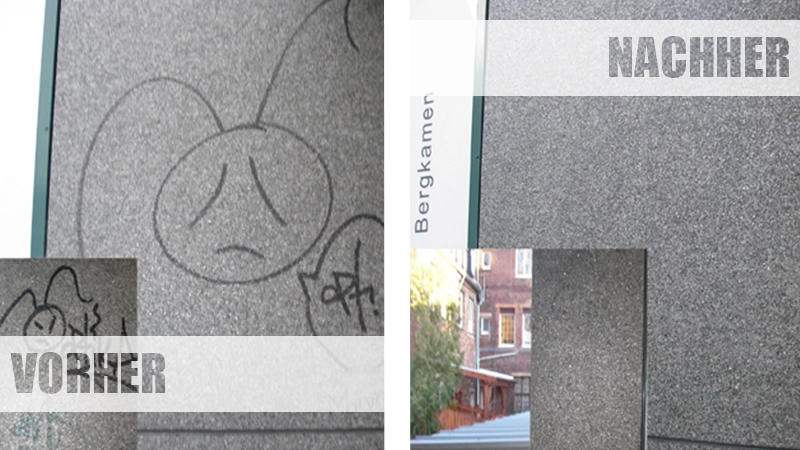Grafitti_entfernen_Naturstein BiermannGenerell verzichten wir hier auf die Reinigung mittels Hochdrucks. Durch den Einsatz eines Hochdruckreinigers werden die Poren immer tiefer ausgespült und es entstehen feinste Spitzen. Aus diesem Grund verschmutzt und vergrünt die Fläche schneller und tiefer als vorher. Die Oberfläche wird durch die Hochdruckreinigung mit jedem Einsatz rauer. Aus diesem Grund raten wir definitiv davon ab und verwendet selbst ebenfalls keine Hochdruckreiniger.