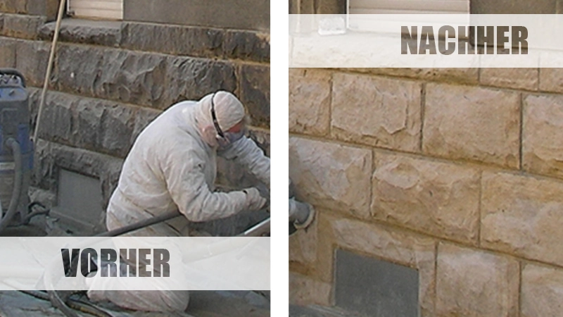 Zur Behandlung von z.B. Außenfassaden eignet sich besonders das Kugelstrahlen bzw. Glasperlenstrahlen. Gegenüber dem Sandstrahlen ist es ein verbessertes Verfahren.